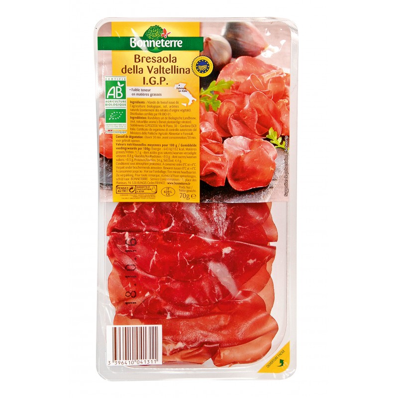 La Bresaola est faite avec de la viande de boeuf dégraissée, salée, poivrée, épicée coupée en fine tranche avec seulement 3% de matière grasse.