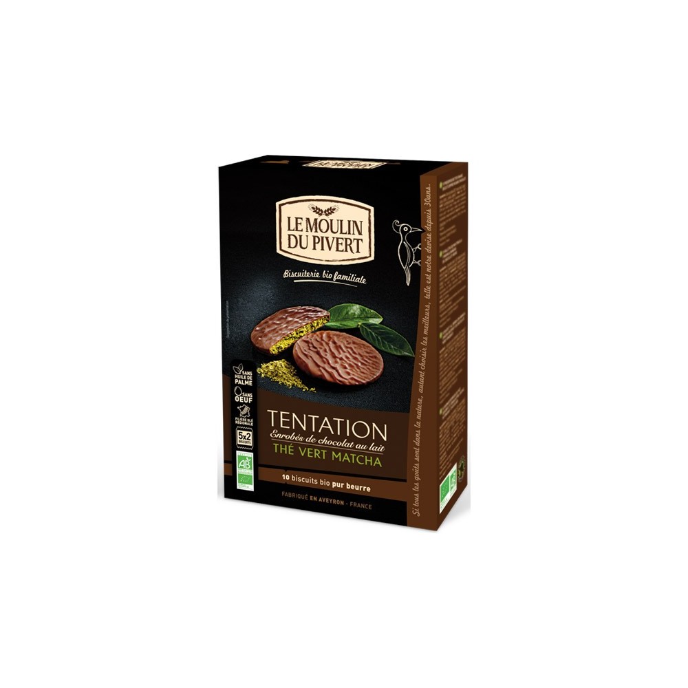 Chocolat au lait* 42% (sucre de canne*, beurre de cacao*, poudre de lait entier*, pâte de cacao*, poudre de vanille*), farine de blé T65*, beurre*, sucre de canne non raffiné*, thé vert Matcha* 1.5%, jus de citron concentré*, poudres à lever : bicarbonate de sodium et d’ammonium, fibre d’avoine*, sel de mer.
