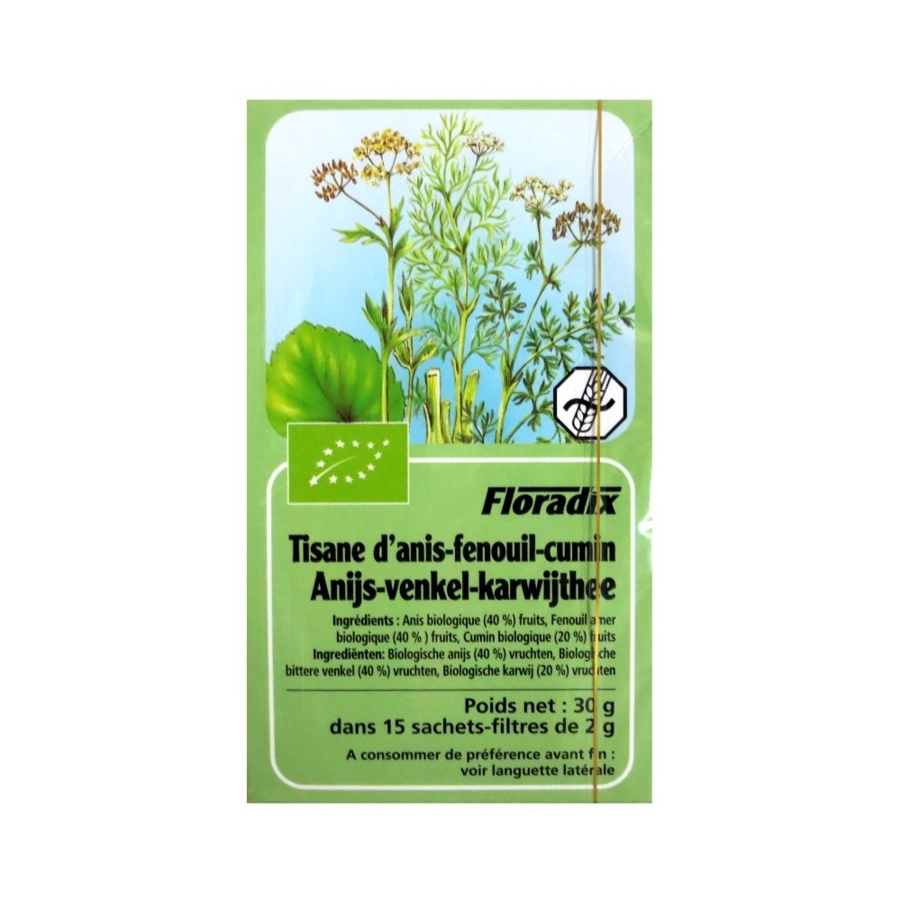 Anis biologique (40 %) fruits, Fenouil biologique (40 %) fruits, Cumin biologique (20 %) fruits.