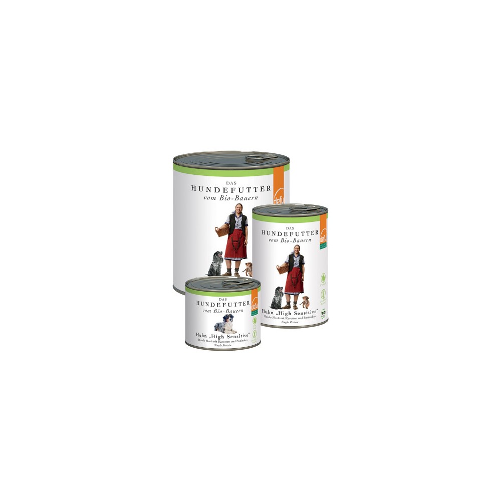 Le menu chien bio « High Sensitive » est une composition savoureuse composée de 87 % de poulet biologique juteux et des meilleures cultures indigènes de nos agriculteurs biologiques.