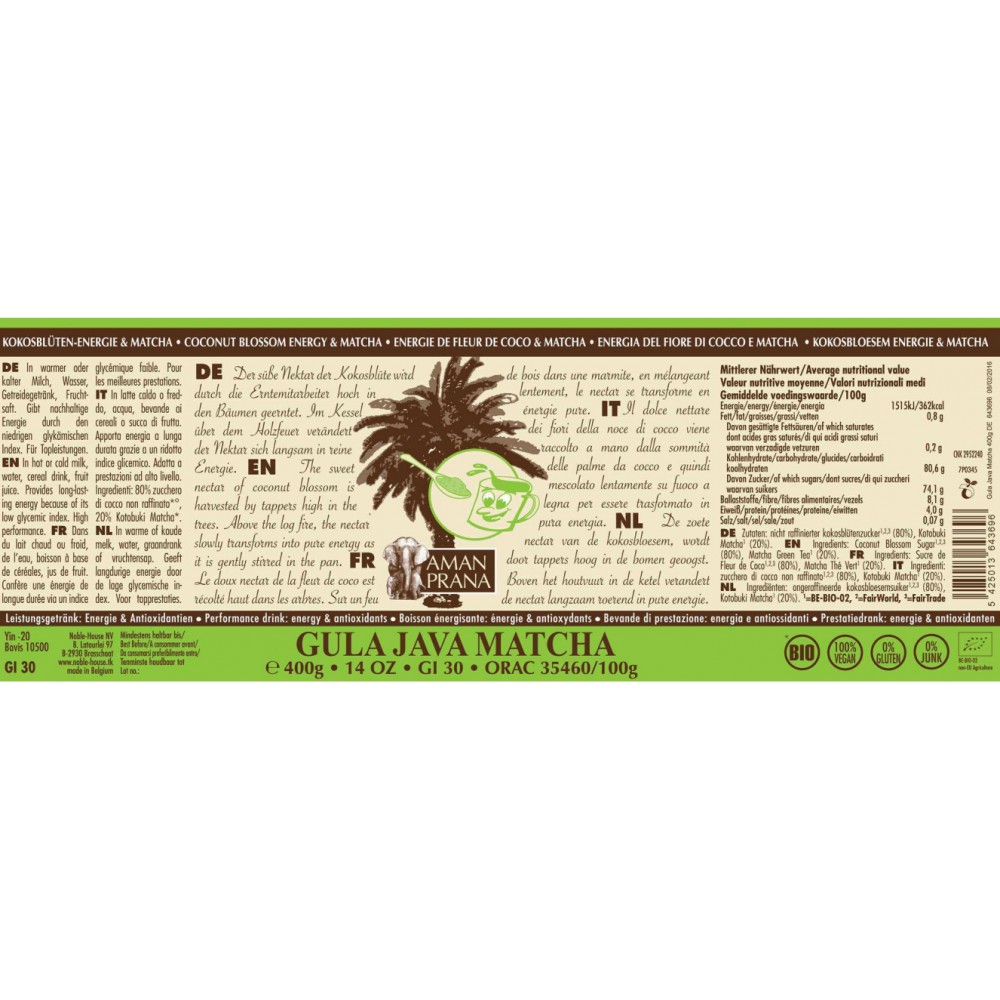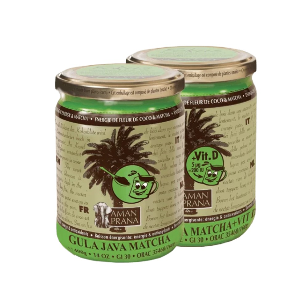 Gula Java Matcha 80% sucre de fleur de coco non raffiné, 20% matcha Kotobuki, 400 g, valeur bovis 10.500, Yin 20, IG 30, ORAC 35.460/100 gGula Java Matcha + Vit D 79,7% sucre de fleur de coco non raffiné, 20% matcha Kotobuki, 0,3% champignon Agaricus séchés, 400 g, valeur bovis 10.500, Yin 20, IG 30, ORAC 35.460/100 g