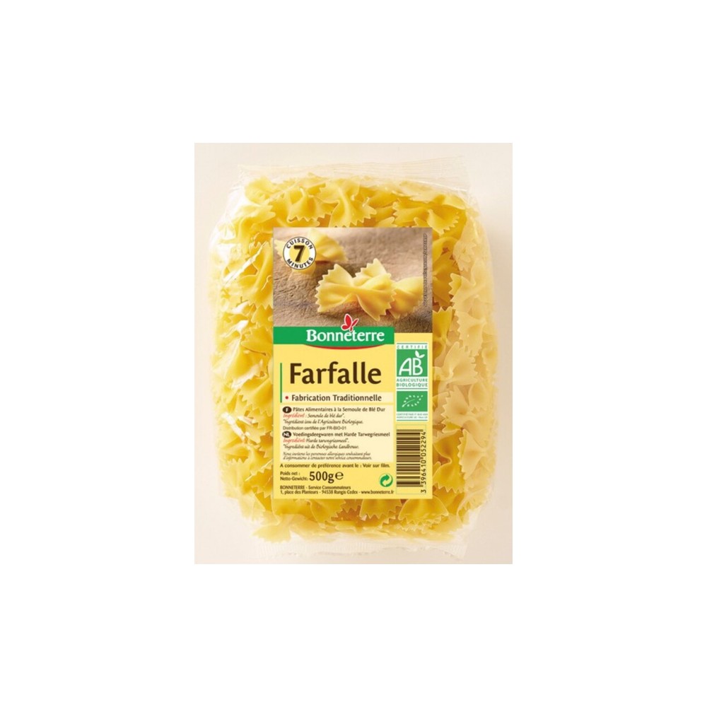 Ces Farfalles sont fabriquées traditionnellement en Italie. Ingrédients issus de l'agriculture biologique. Sachet de 500g