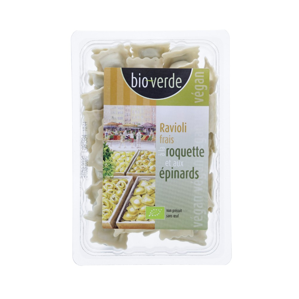 BLÉ DUR*, épinards* (28%), eau, chapelure* (FARINE DE BLÉ*, sel gemme, levure), flocons de pomme de terre*, huile de tournesol*, sel gemme, ail*, roquette* (0,5%), muscade*