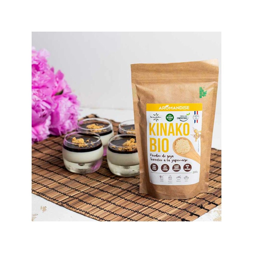 le Kinako, c'est tout simplement des graines de soja torréfiées broyées et réduites en poudre. Utilisée traditionnellement au Japon, on la retrouve dans toutes sortes de sucreries comme mélangée à du chocolat ou sur des gâteaux de riz (mochis).