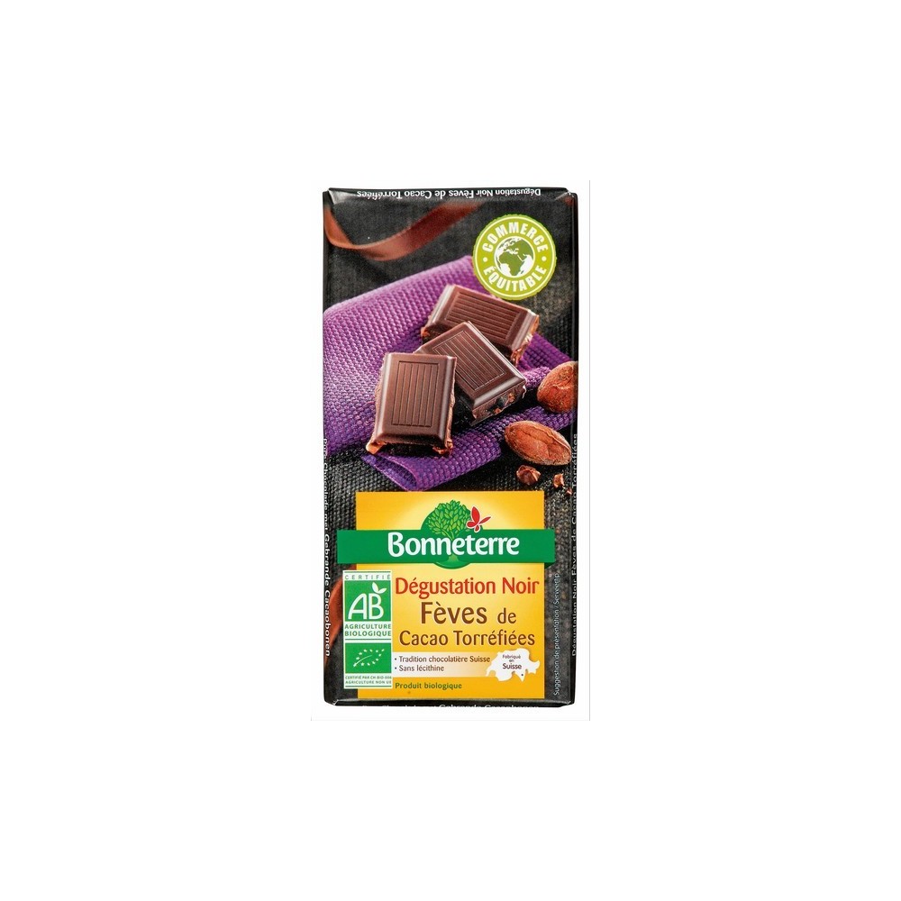 Pâte de cacao*, sucre de canne*, beurre de cacao*, éclats de fèves* de cacao torréfiées (10%), vanille* moulue. Cacao: 60% minimum dans le chocolat