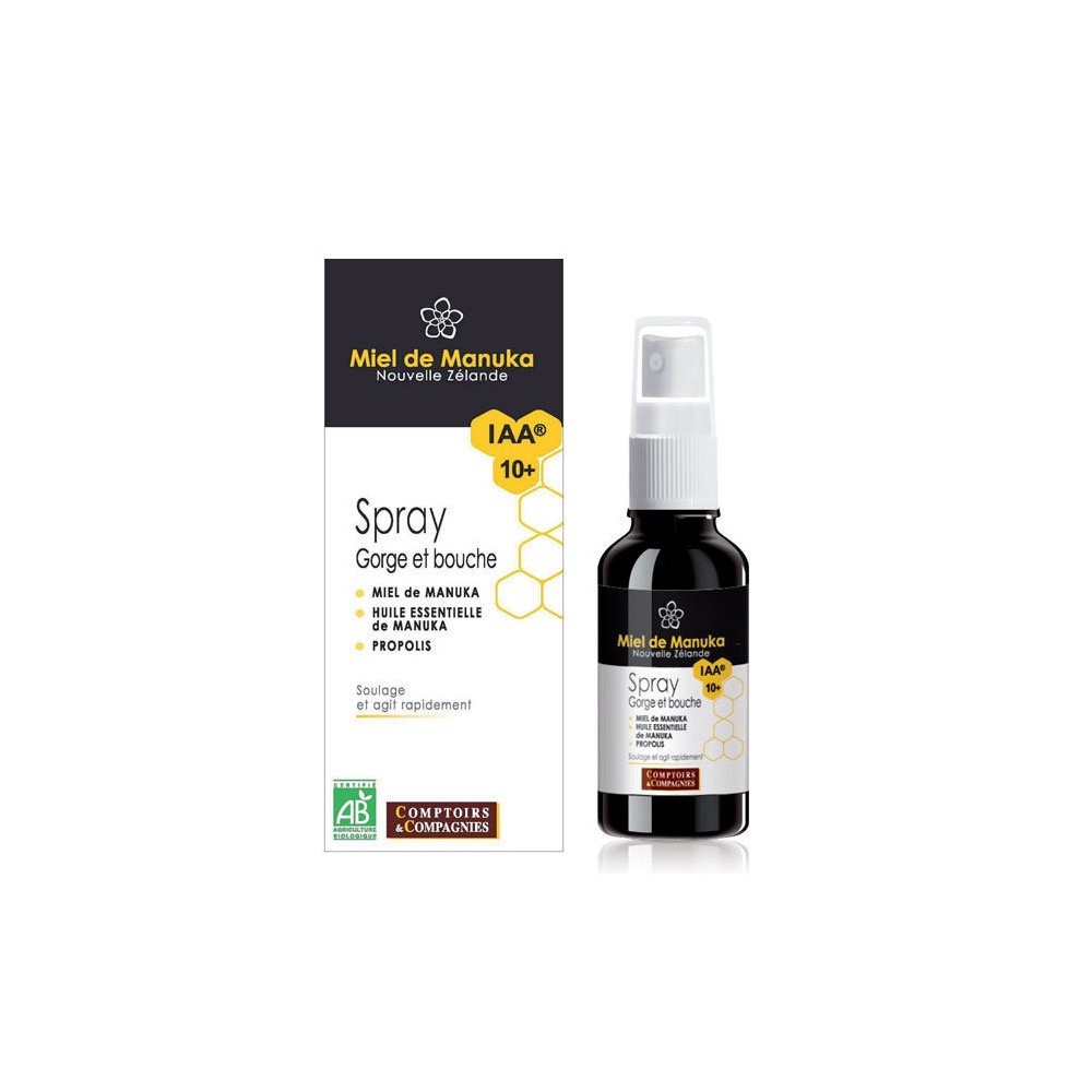 Ce spray gorge et bouche au miel de Manuka est fabriqué en France.