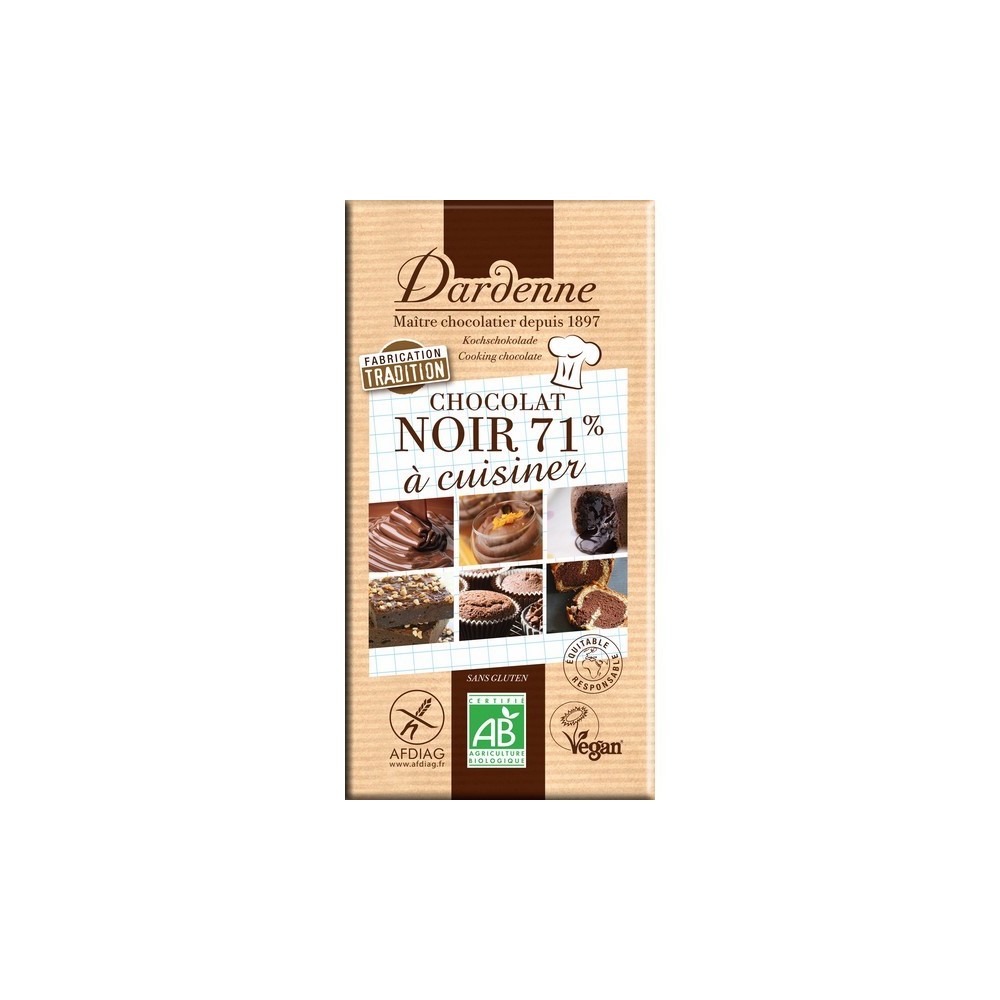 Cacao (pâte de cacao)*, sucre de canne blond*, beurre de cacao*, vanille naturelle en poudre*. Cacao mini : 71 %.*ingrédients issus de l'agriculture biologique.