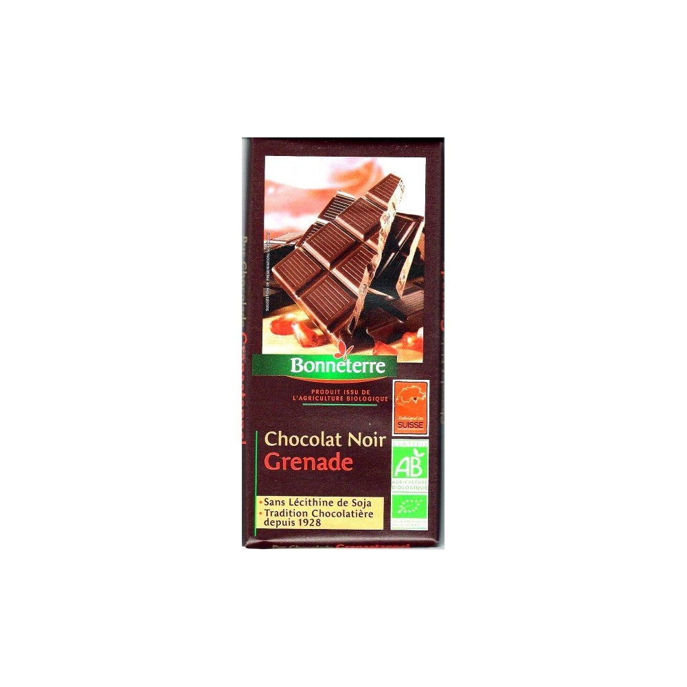 Pâte de cacao*, sucre de canne*, préparation à la grenade* 12% (grenade* 78,4%, jus de pomme concentré*, farine de riz*, épaississant : pectine), beurre de cacao*, vanille moulue*. Cacao: 60% minimum dans le chocolat.