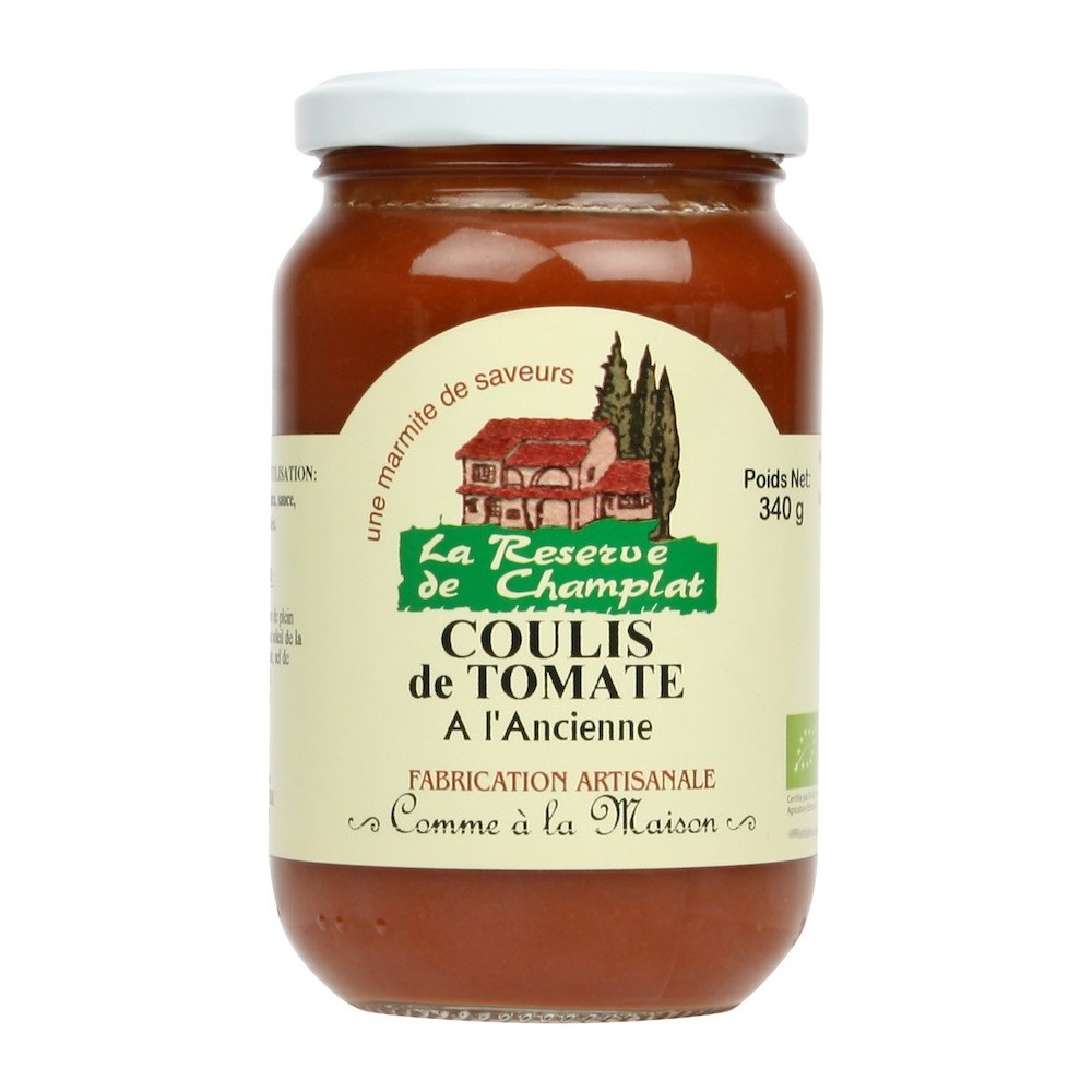 Coulis de tomate* à l’ancienne, préparé avec des tomates fraîches mûries au soleil de la Drôme Provençale, oignons*, basilic*, ail*, huile d’olive vierge extra*, sel de Guérande.