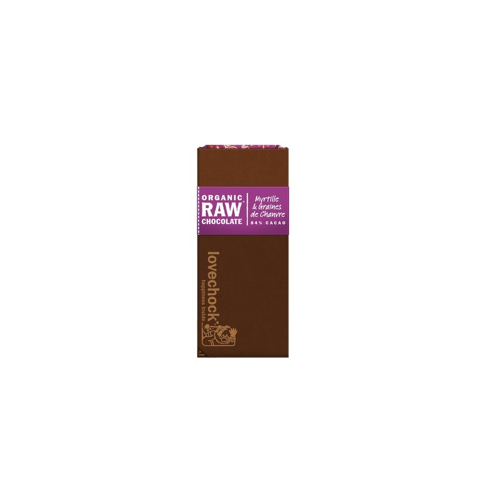 Pâte de cacao crue*, beurre de cacao*, sucre de fleur de noix de coco*, graines de chanvre* (7 %), dattes*, myrtilles lyophilisées* (4 %), baobab en poudre*, vanille Bourbon*, sel marin.