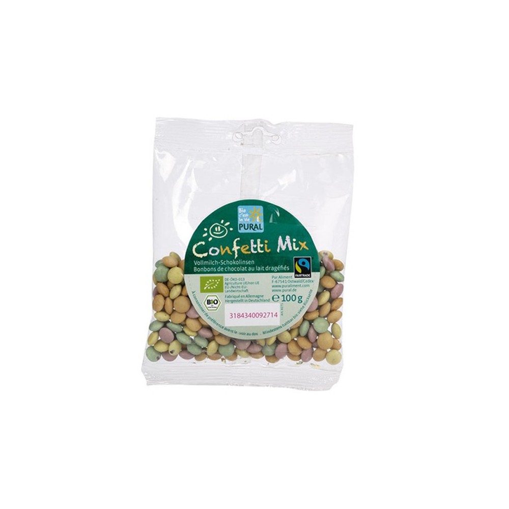 Chocolat au lait 60% (sucre de canne brut*, lait en poudre* 11,88%, beurre de cacao* 11,1%, pâte de cacao* 7,32%, petit lait en poudre* 2,94%, émulsifiant (lécithine de tournesol); dragée (sucre de canne roux*, amidon de riz*, sirop de maïs*, colorants extraits de plantes et de fruits (carthame, pomme*, algue), jus de légumes concentrés (carotte noire*, betterave rouge*), épaississant (gomme arabique), agent d´enrobage (cire de carnauba, cire d´abeille).