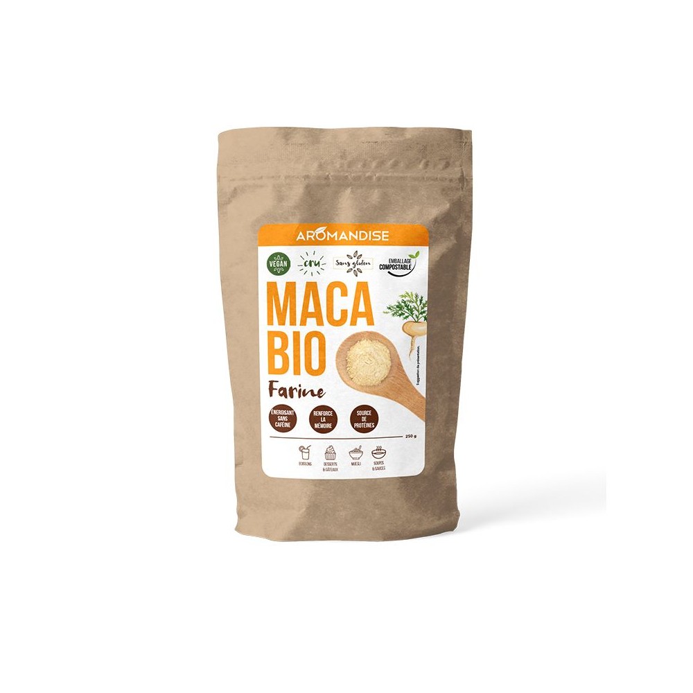 Bienfaits : la Maca est riche en calcium, magnésium, fer, et une source de zinc et de protéines. Elle stimule l'activité intellectuelle et renforce la mémoire, soutient la performance physique et mentale. C'est également un énergisant sans pour autant contenir de caféine.