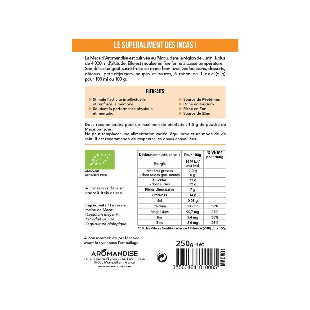 | Compositions | Poudre de racine de Maca* (Lepidium meyenii). * Produit issu de l'agriculture biologique |