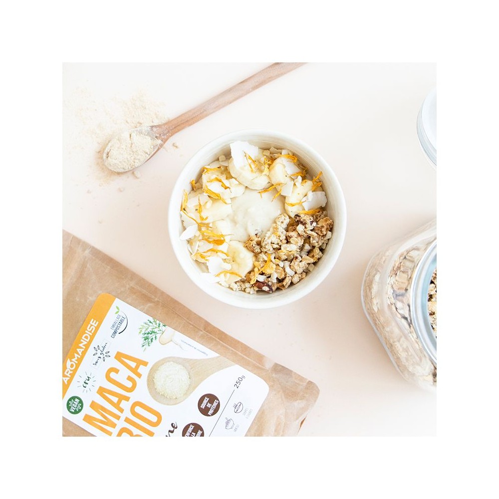 Le superaliment des Incas ! Aussi appelée "Ginseng Péruvien", la Maca est une racine aux nombreuses qualités nutritionnelles ! Elle s'utilise aisément dans toutes les cuisines : son délicieux goût sucré-fruité se marie bien avec vos boissons, desserts, petit-déjeuners, soupes et sauces...etc.