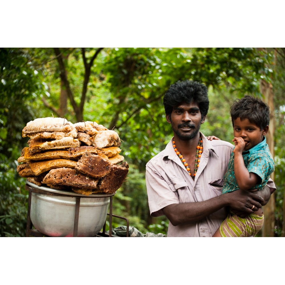 Ce miel rare et précieux est récolté par les tribus "chasseur de miel" dans les montagnes du Sud de l'Inde. Dans cette région reculée, les abeilles sauvages butinent le pollen et le nectar des plantes médicinales de la forêt pour obtenir un miel qui n'a subi aucun traitement à part une simple filtration traditionnelle. Pour apprécier toutes ses vertus, dégustez le tel quel et éviter de le chauffer à plus de 35°
