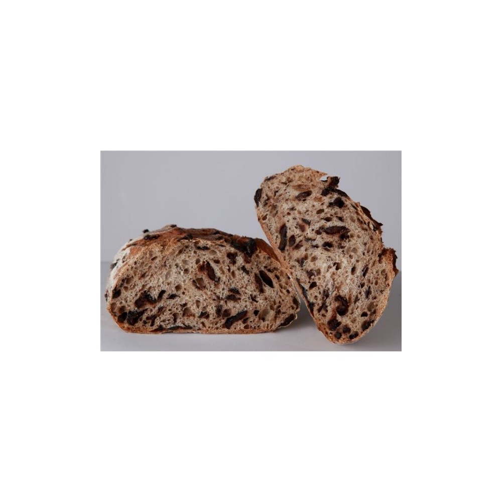 Farine bise (36,4%), Eau (26,3%), Olives (20%), Levain de blé (16,8%), Sel de Guérande (0,5%).