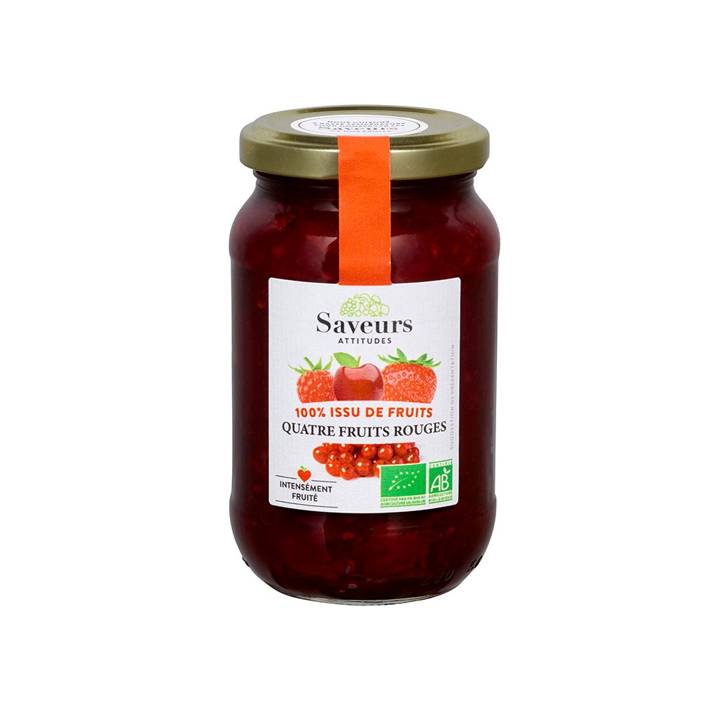 Ingrédients : Fruits rouges* (55%) : cerise*, fraise*, groseille* et framboise*, jus concentré de raisin rectifié*, gélifiant : pectine de fruits, lithothamne.