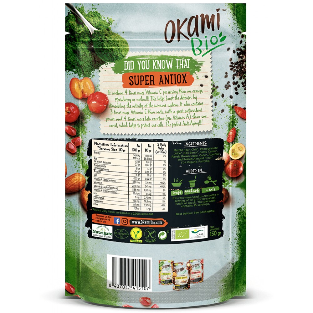 150g de mélange de poudre 100% biologique contenant du thé matcha, du, du jus de grenade, des baies de goji, du camu camu, de la canne à sucre brun panela, de l’acérola et de la farine d’amande pelée.