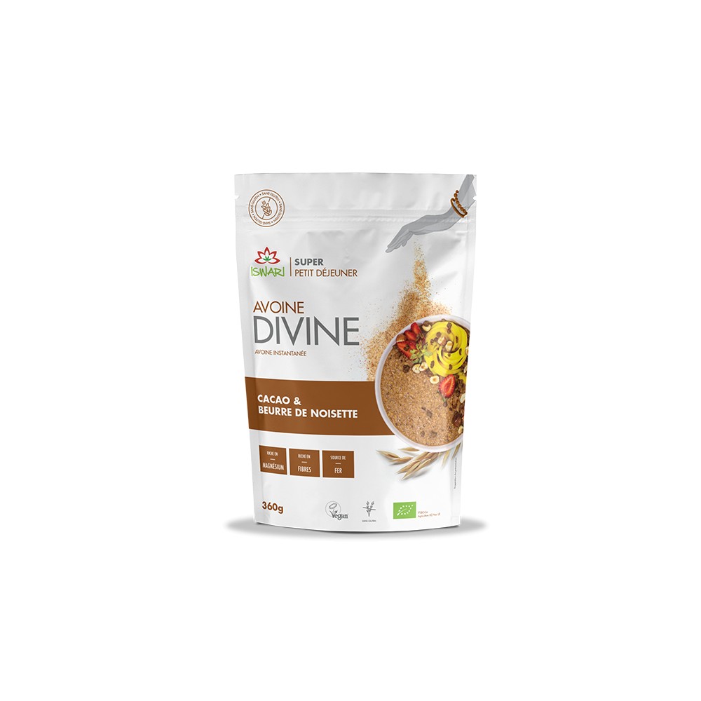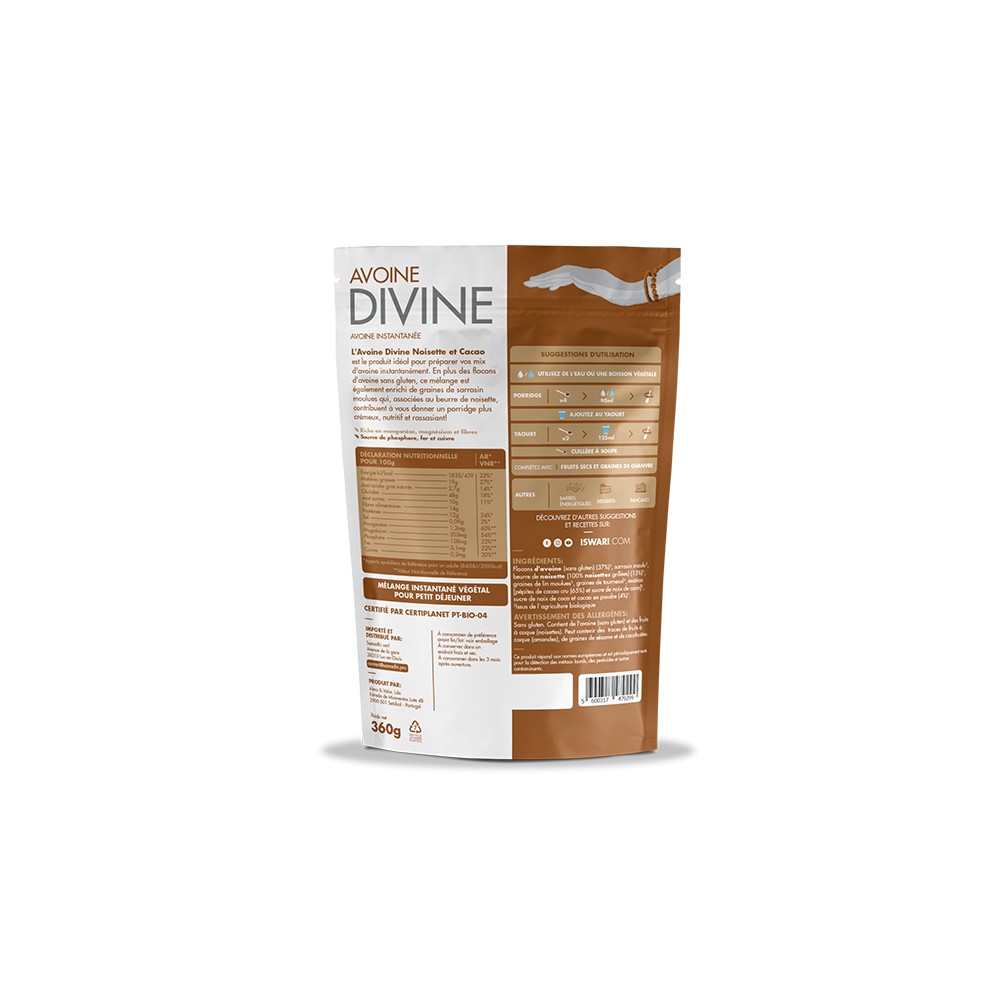 Avoine Divine Noisette et Cacao est un mélange sans gluten, idéal pour préparer vos bouillie d'avoine instantanément, sans avoir besoin de cuisiner. Pour cette raison, vous pouvez ajouter ce mélange au yaourt, aux smoothies ou à la confection de pâtisseries. En plus des flocons d'avoine sans gluten, ce mélange est enrichi de beurre de noisette, ce qui lui donne une plus grande onctuosité, et de graines de lin qui contribuent à un mélange plus nutritif et plus satisfaisant.