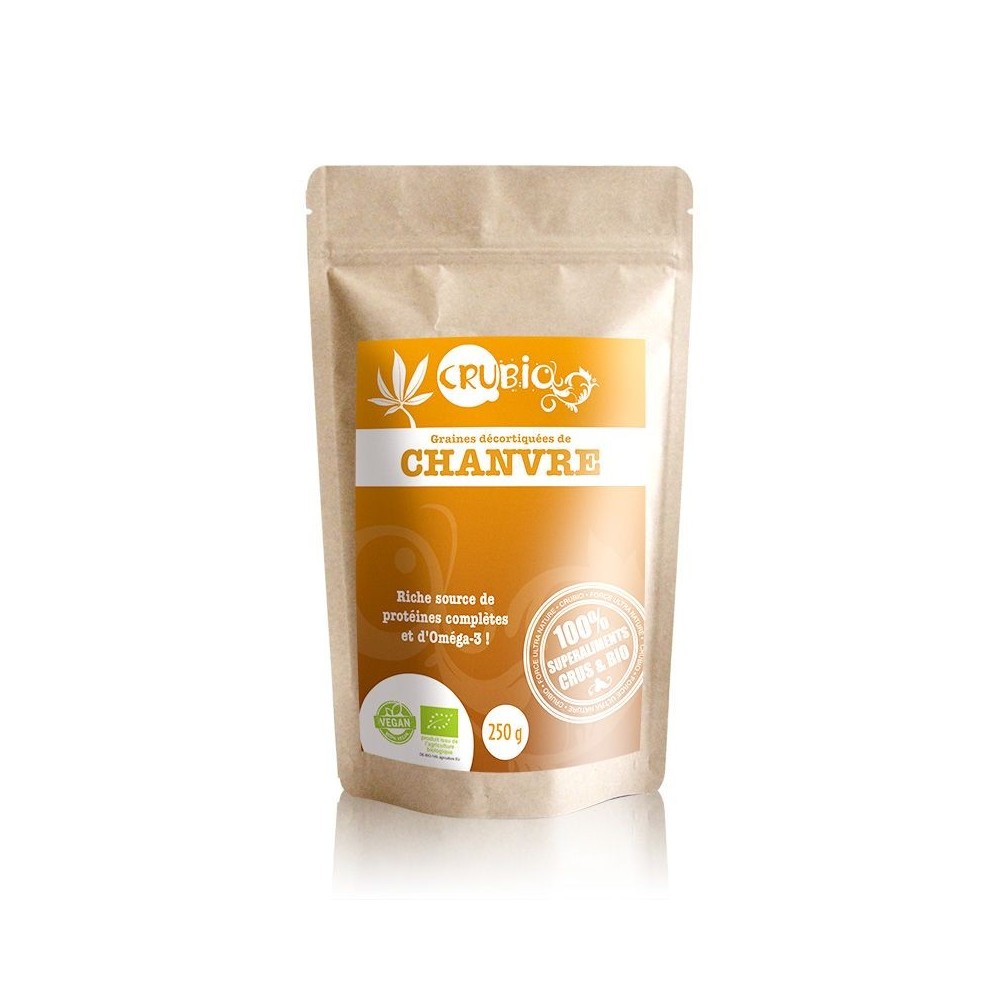 100% graines décortiquées de chanvre cru, issues de l'agriculture biologique. A conserver au frais après ouverture.