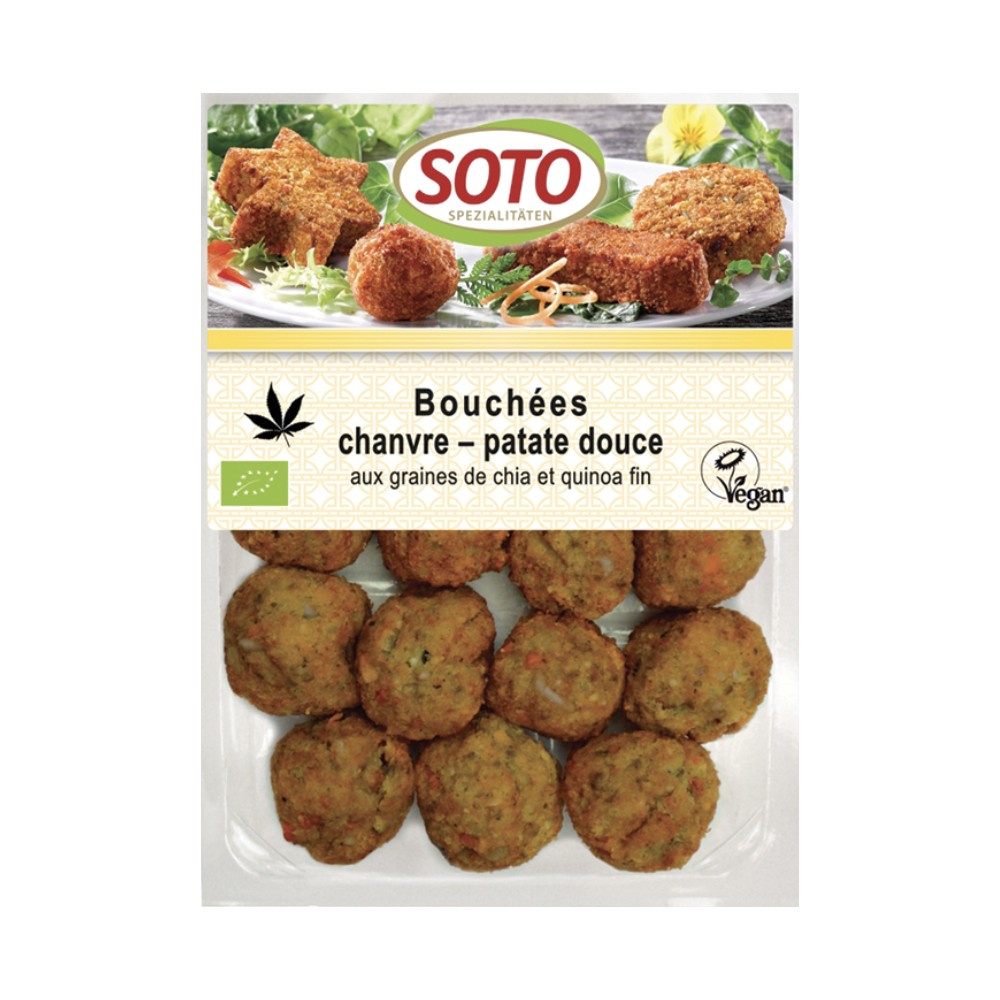 | Patate douce* (22%), quinoa* (22%), courgettes*, oignons*, carottes*, farine de pois chiche*, chapelure de maïs*, graines de tournesol*, huile de tournesol*, graines de chanvre* (2%), graines de chia* (Salvia hispanica) (2%), jus de citron*, sel de mer, roquette*, épices*, huile de citron* *issus de l'agriculture biologique | |